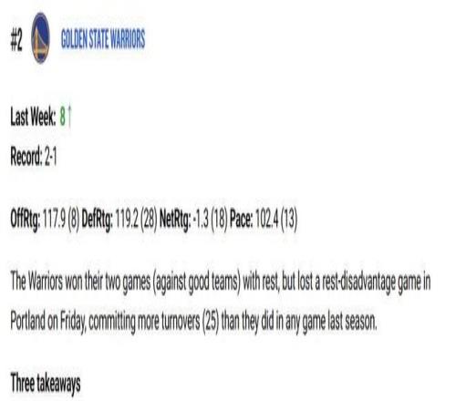 由于榜单公布前勇士队才输给开拓者,一度让这样的排名引起热议,结果勇士队本场用击败灰熊开季4战3胜的表现强势完成自我证明,并且一口气亮出3大争冠杀招。
