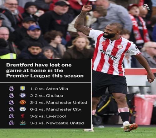 赛后根据统计,虽然布伦特福德本赛季客场成绩不佳(1胜4负),但他们在主场已经先后斩落了阿斯顿维拉、曼联、利物浦以及纽卡斯尔联,此外他们还战平了切尔西,期间他们在主场唯一的一场败仗是10月5日0-1不敌曼城。