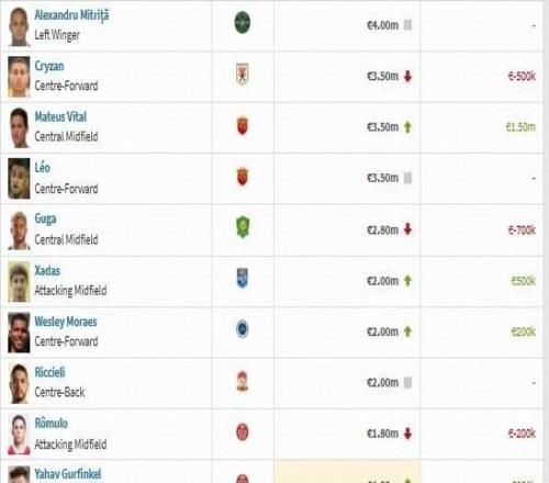 中超球员身价榜:米特里策居首,克雷桑第二,王钰栋第19