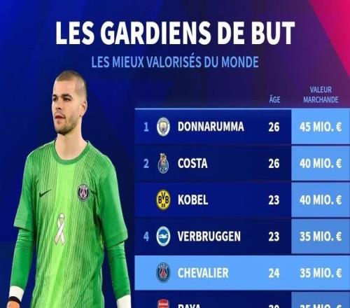 北京时间12月15日,在更新了法甲球员的身价之后,德转列出了目前世界足坛身价排名前10的门将,多纳鲁马4500万欧元第一,此次更新后身价下跌500万欧元的舍瓦利耶以3500万欧元并列第